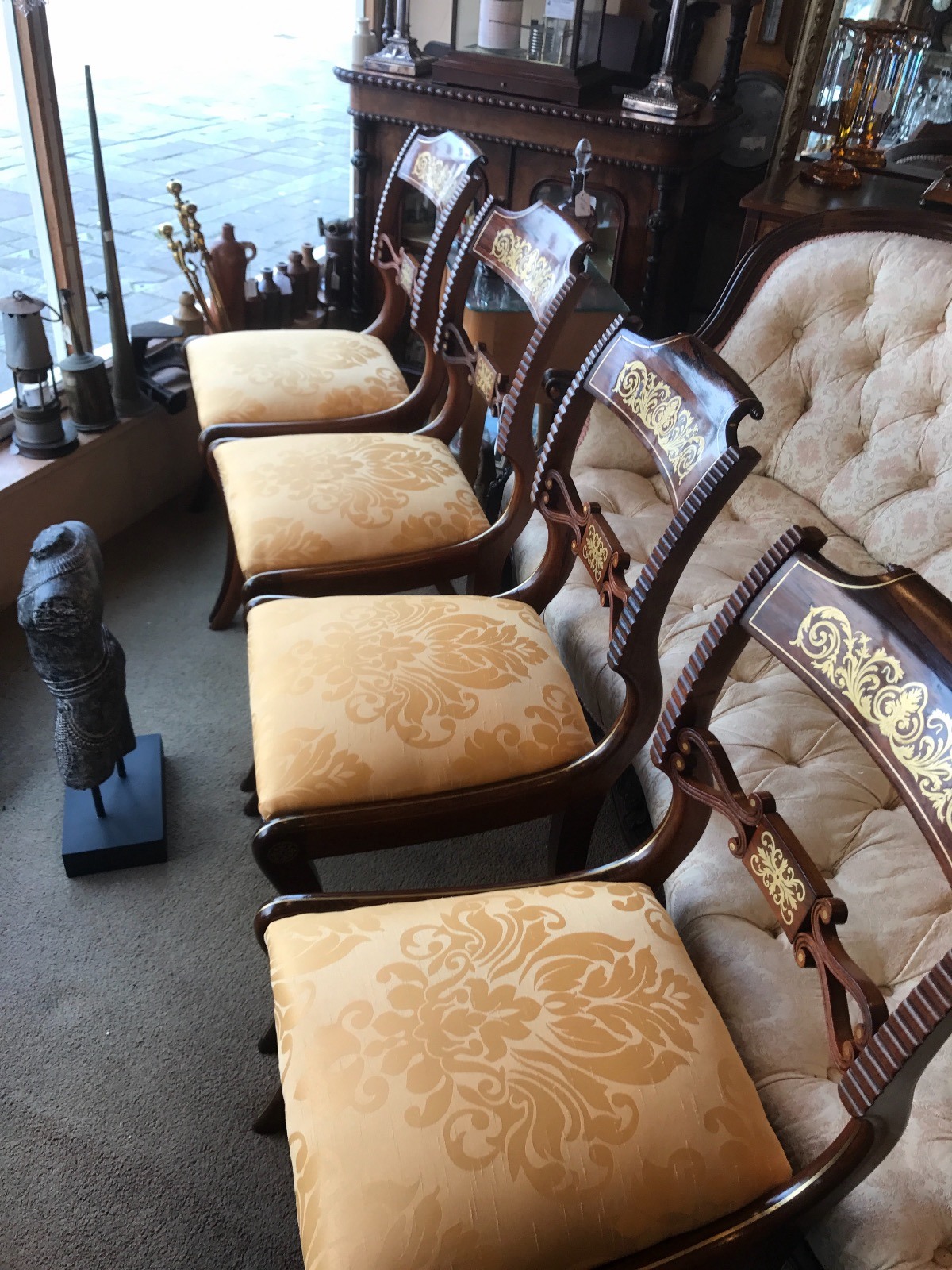 Here we offer on of the best set of four brass inlaid regency rosewood dining chairs that I have ever had they have been completely restored back to original condition.