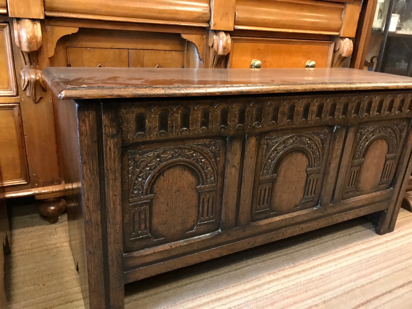 Top quality solid Oak 6 plank coffer / trunk with 3 carved panels to the front lovely colour and tip top condition. Bargain.