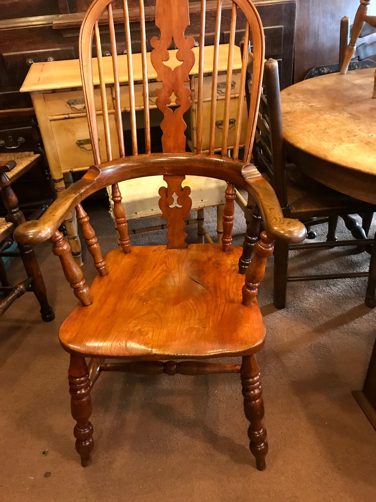 Sold in original restored condition is this solid and sound country broad arm chair in ash, beech and one piece elm seat.nice colour standing on turned legs with double H stretcher
