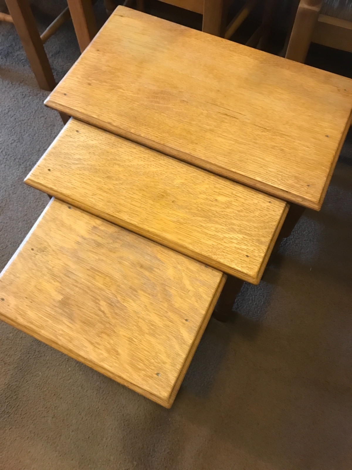 A good solid light oak 20th Century nest of tables on turned stretchered base all treated with stain resistant material