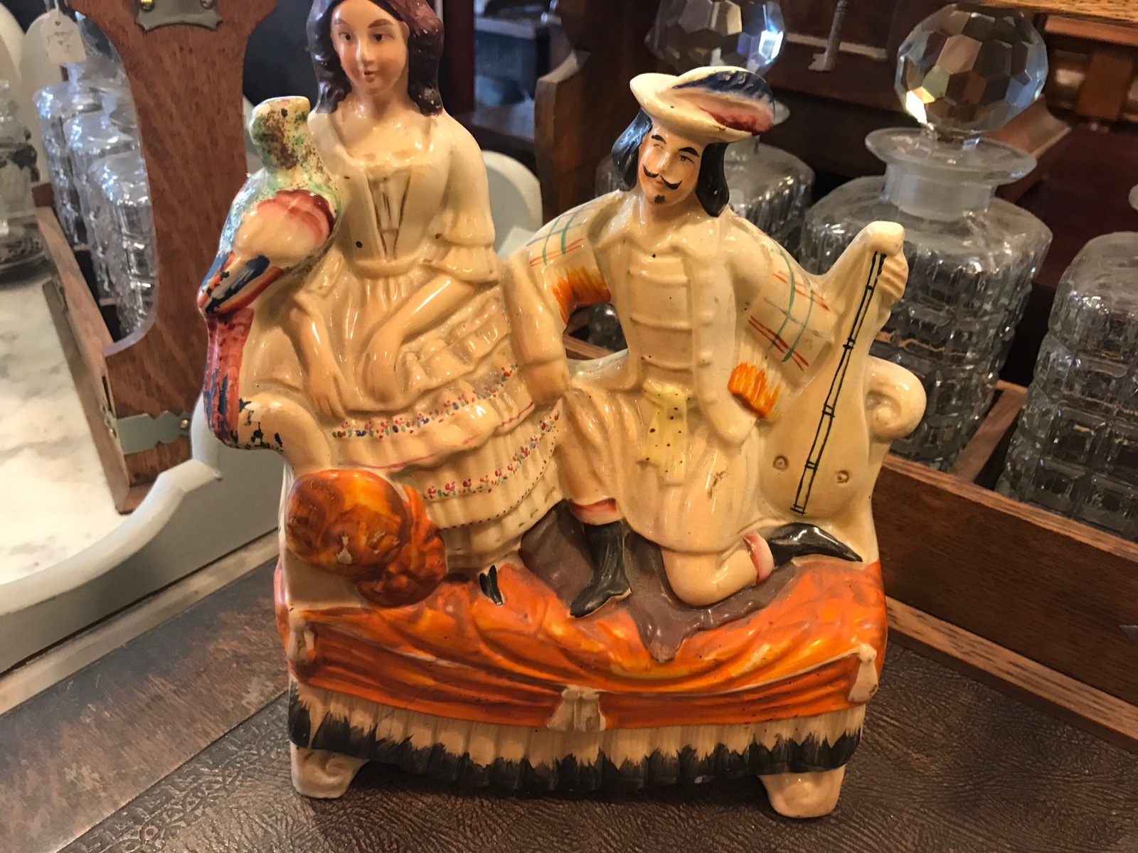 Offered for sale is this 19th Century antique Staffordshire figure of two people sitting on a bench holding a bird