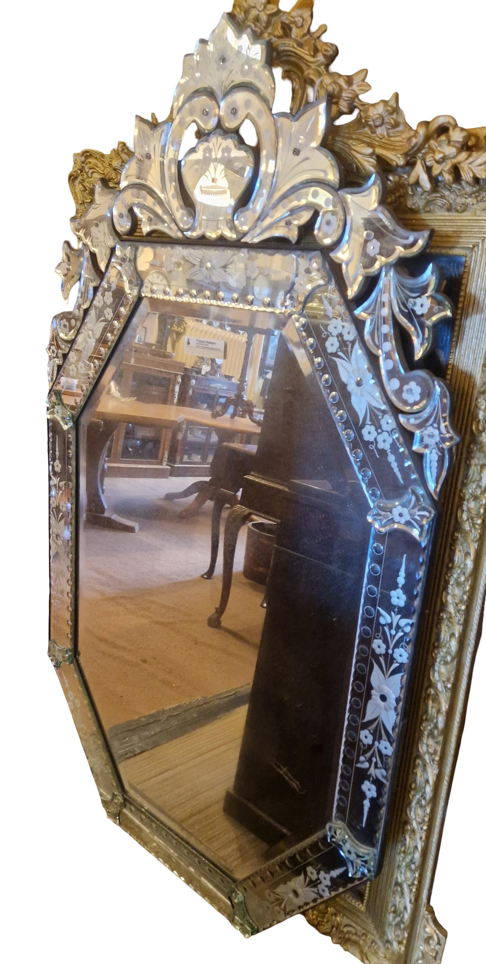 This is a vintage Venetian style mirror. The mirror features an ornate frame typical of Venetian design, characterised by intricate details and decorative elements. The glass is etched, cut and bevelled to make the most of the reflected light. It is made of glass with wood on the reverse. The mirror is in good condition.