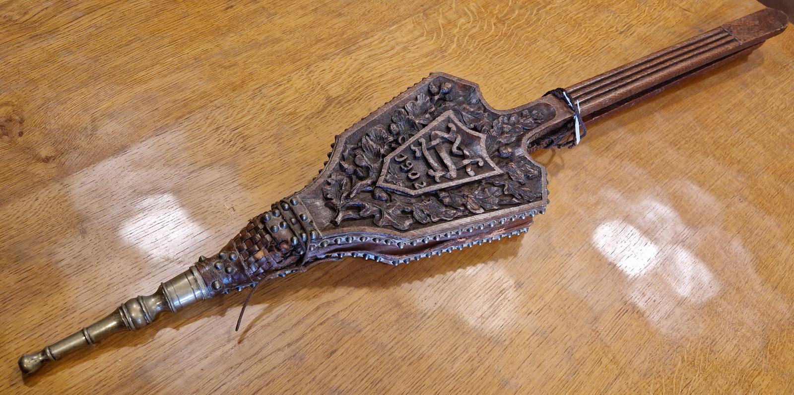 This is a pair of highly decorated antique bellows, used for stoking fires. It features intricate carvings to the wood on the front, there are densely placed oak sprigs with acorns framing a shield with the entwined initials, M.S., the handle has reeded finish. The backplate is plain. The brass nozzle has a ribbed conical shape and has woven leather and brass pins attaching it to the body. The concertinaed leather has some movement, but would benefit Frome a conditioning cream. The leather is fitted to the body with brass pins. The oak has a rich patina throughout. There is air leaking somewhere, so the bellows are not at the moment completely functional. This is a superbly decorative piece.