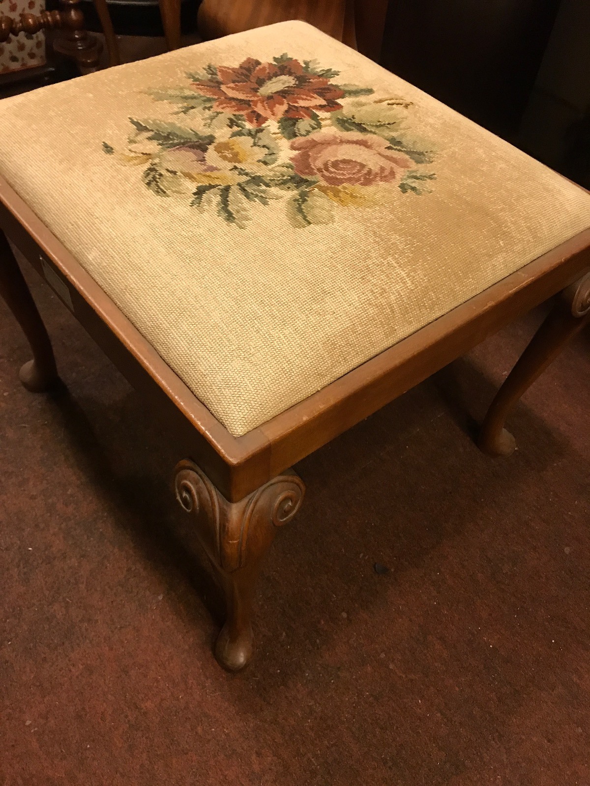 Offered for sale is this fantastic mahogany needlework tapestry stool. It has mahogany cabriole legs.