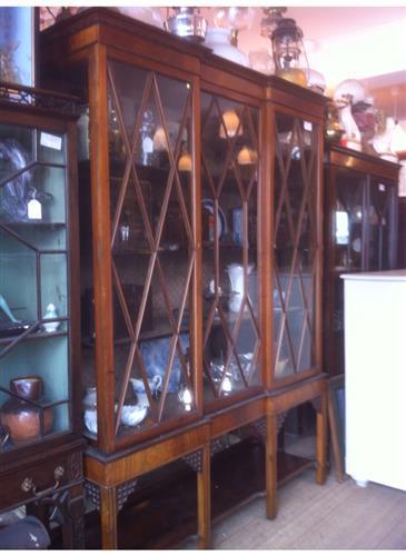 Offered for sale is this Edwardian antique mahogany, breakfront antique display cabinet, with diamond lattice glazing.