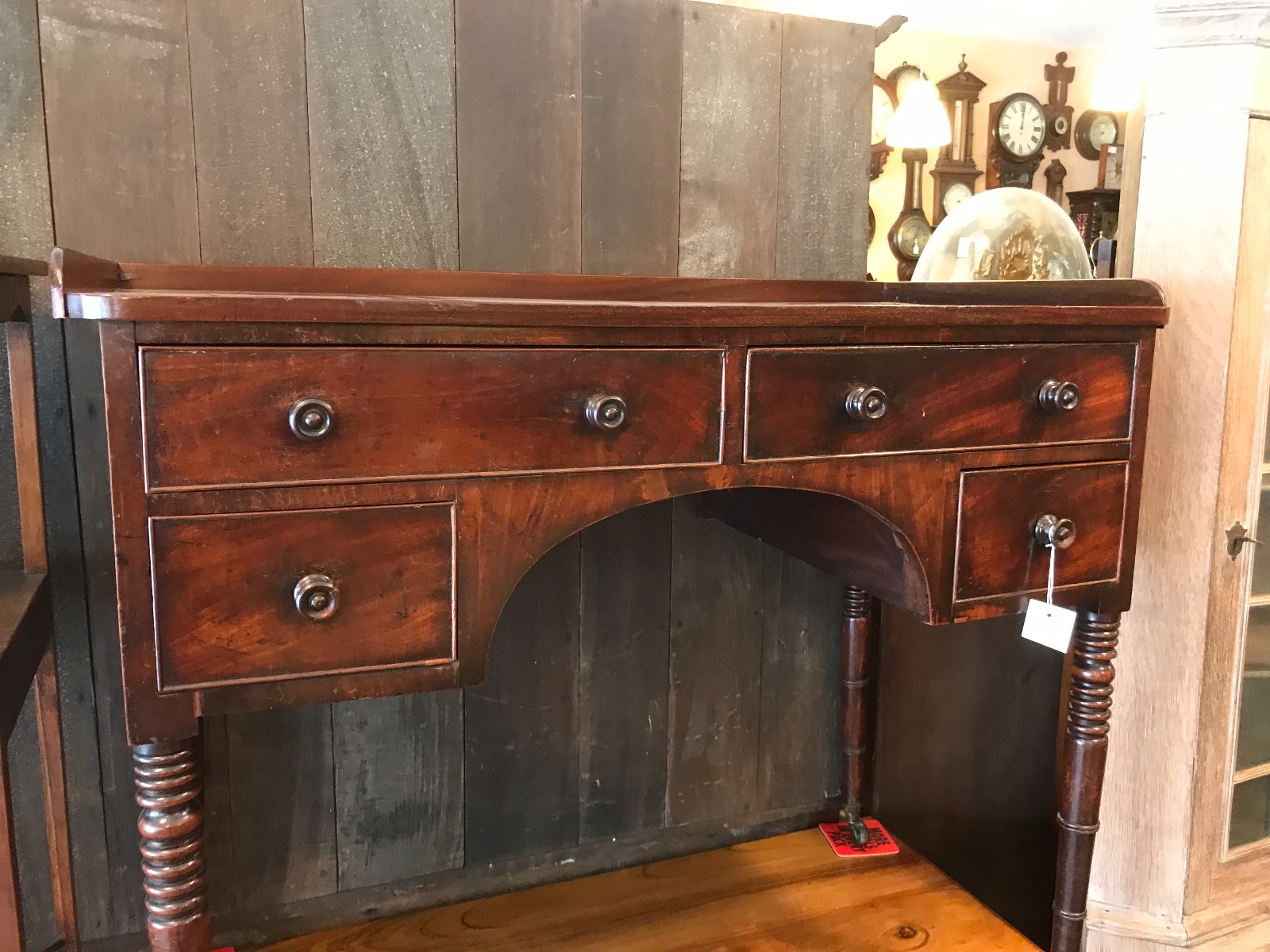This is an unrestored and original George III antique mahogany tray top side table with 4 draws and a nice colour.