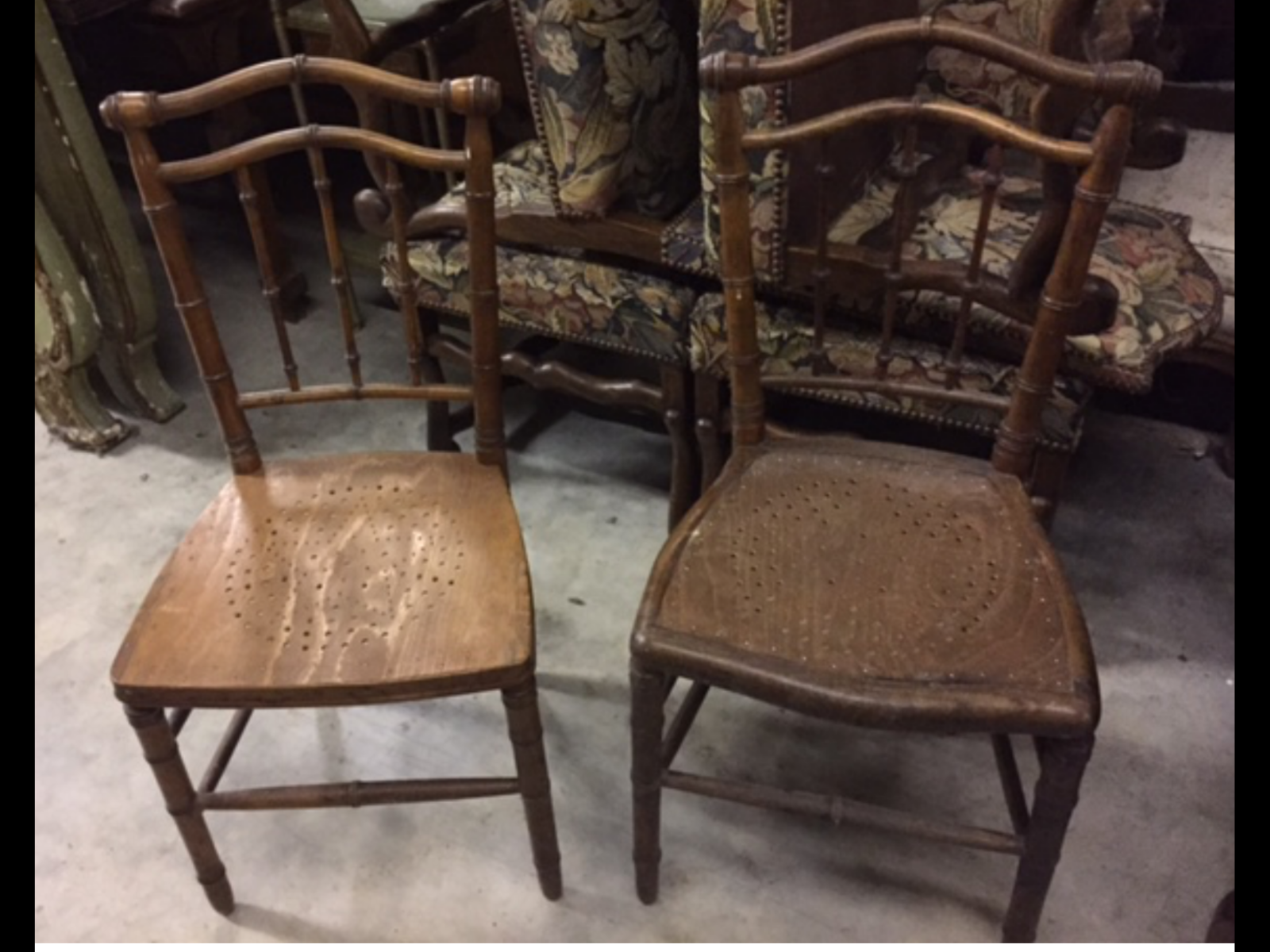 Two Original and untouched French antique bamboo design side chairs with shaped toprails and pierced seats. Price each chair as they are slightly different.