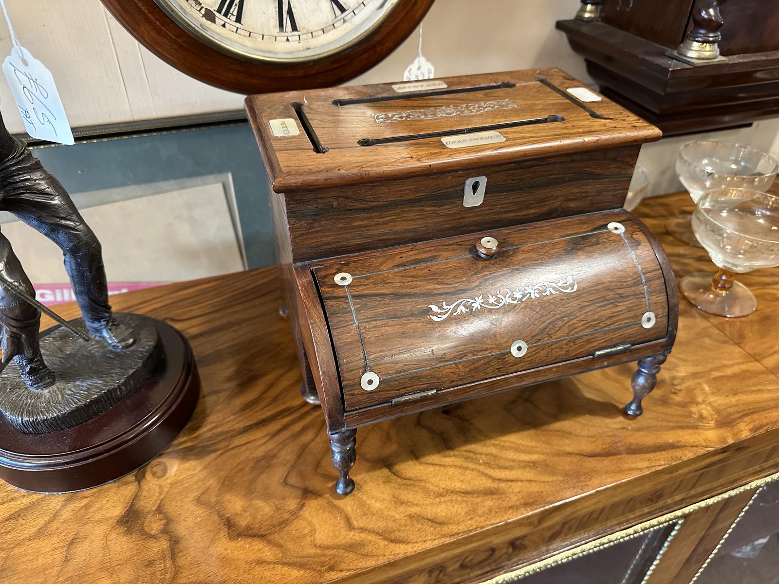 Very unusual early 19th century stationary desk tidy in rosewood in a piano shaped case. Superb item with four slots for different note-lets and further behind the cylinder front with mother of pearl inlay.