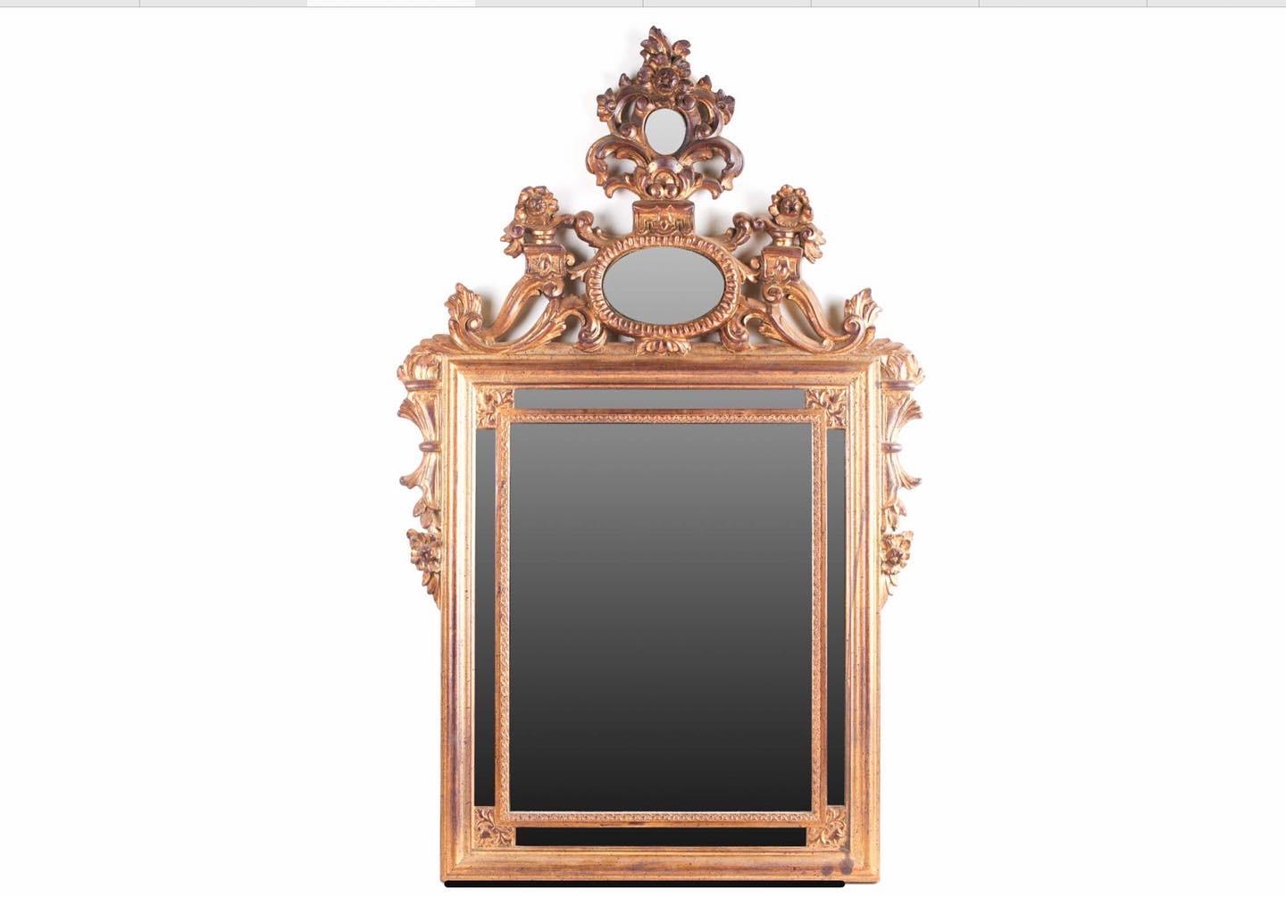 We offer for sale this decorative gilt boarder wall mirror in good condition with very ornate top carving in the florentine neo-classical style with six surrounding mirrors.