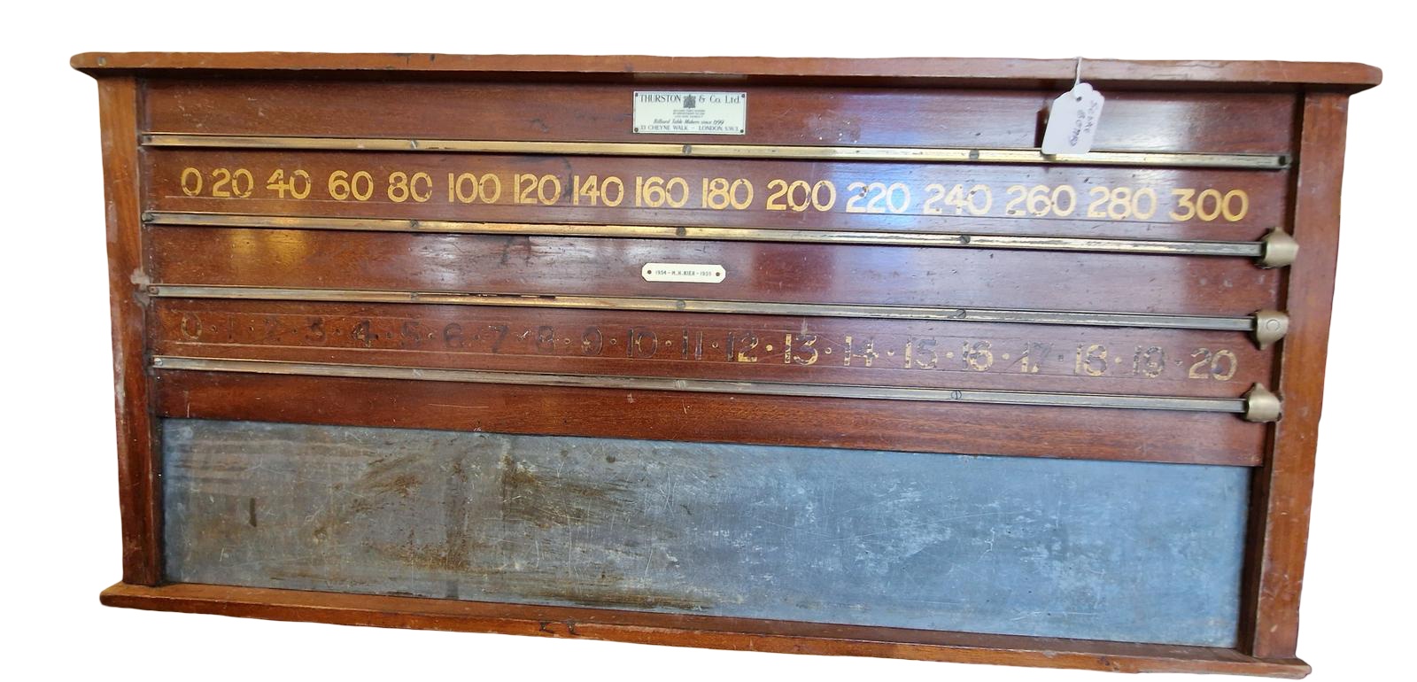This is a vintage Thurston & Co mahogany snooker or billiard scoring board. This is a wall-hanging example that is largely free of decoration. It has gilt numbers with sliding brass markers above a slate chalkboard. There is the makers plaque and a further nameplate with a date possibly the club captain or champion. Some numbers are faded, but it is otherwise in good condition.