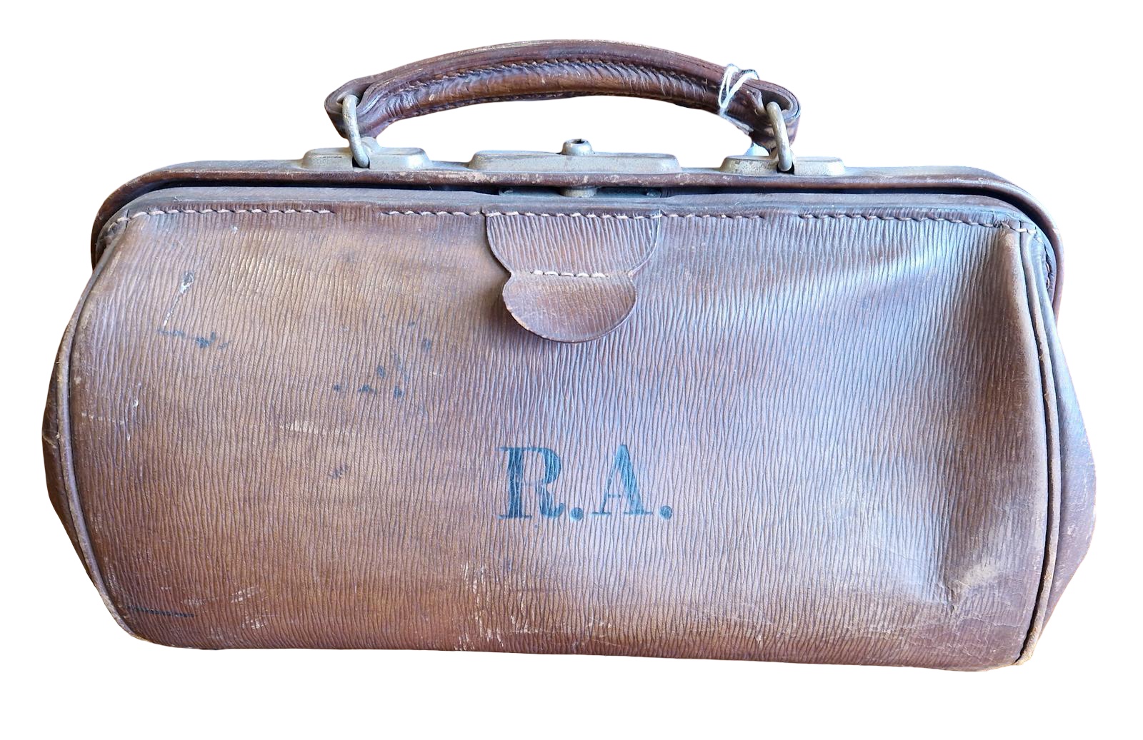 This vintage leather Gladstone bag, dated around 1940, it features classic design characteristics of this timeless style. It is constructed from genuine brown cowhide leather. The bag includes a top handle for carrying and a lock that is missing the key. It shows signs of wear consistent with age and use. By using leather baslm the leather would improve massively. The interior is in good condition.
